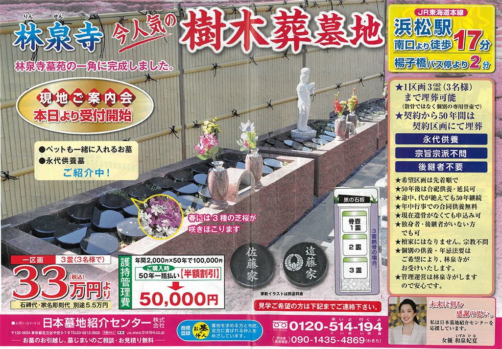 | 対応事項 | ■樹木葬墓 33万円~(税込)(3霊納骨タイプ・石代、彫刻代 別途16.5万円) 50年分護持費一括5万円 |
