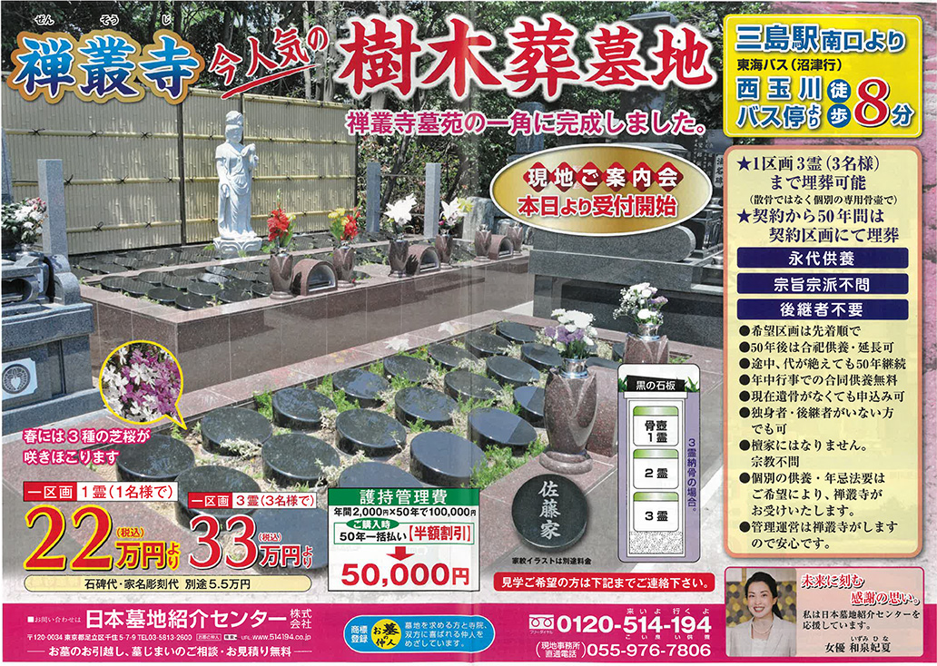| 対応事項 | ■樹木葬墓 22万円~(税込)(1霊納骨タイプ・石代、彫刻代 別途16.5万円) 50年分護持費一括5万円 33万円~(税込)(3霊納骨タイプ・石代、彫刻代 別途5.5万円) 50年分護持費一括5万円 ■高級型墓石付き完成墓地 98.05万円~(税込)すべて込み(永代使用料、石碑代、外棚、納骨室、彫刻代、塔婆立、工事代) |